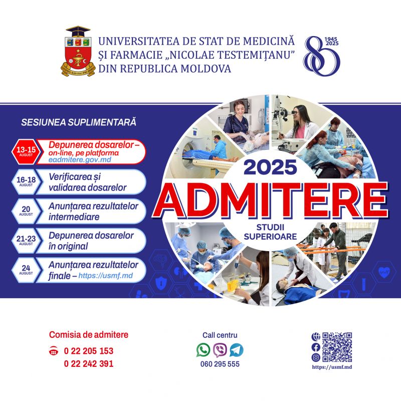 Universitatea de Stat de Medicină și Farmacie „Nicolae Testemițanu” din Republica Moldova anunță organizarea sesiunii suplimentare de admitere pentru locurile rămase neacoperite atât pentru studii superioare de licență și integrate, cât și pentru studii superioare de master, la următoarele programe de studii: